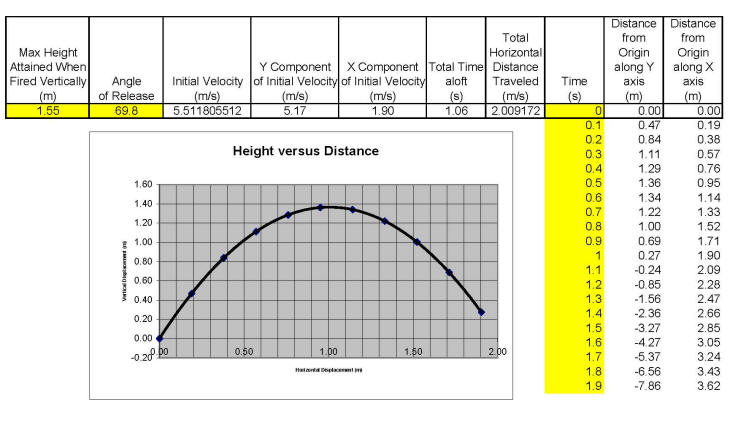 1. Set up an Excel spreadsheet to perform trajectory calculations for you. Your spreadsheet should look like the one farther down the page. The yellow cells are the input cells. Once your spreadsheet is created, you should be able to type in any "max height attained when fired vertically," and any "angle of release," and have the rest of the values computed for you automatically. Click here to try out a spreadsheet created by Mr. Stapleton. The formulas in this example are locked and hidden, but you can change the inputs. You can also use this example spreadsheet as a template; copy it and paste it into Excel -- and then fill in the blanks with formulas. To create the graph, see directions in #2, below. You should also read the "Excel Hints," below.